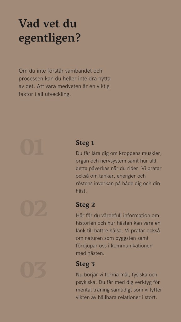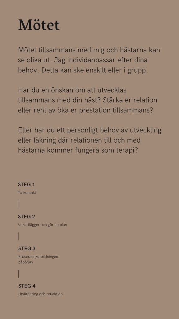 Natural horsemanship har gett mig en otrolig förståelse för hästen som djur samt verktyg för att kommunicera i såväl ridning som markarbete. Denna förståelse, samt mina år av erfarenhet, vill jag dela med mig av då jag ser att det kan verka gynnsamt i flera led.